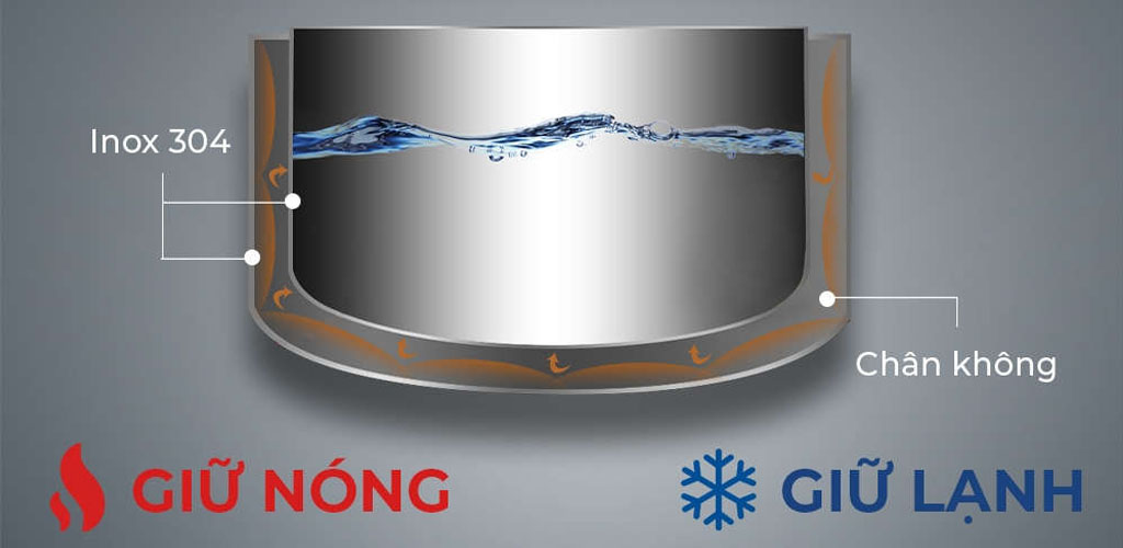 Giữa phần vỏ và phần ruột inox bên trong là phần chân không. lớp chân không giúp cách nhiệt tốt hơn.
