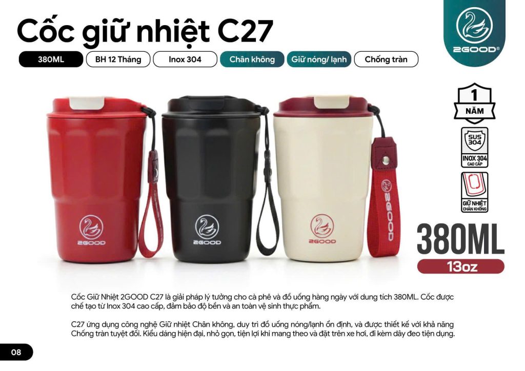 2GOOD C27 380ml Cốc Giữ Nhiệt thiết kế nhỏ gọn tiện mang theo hằng ngày. Chất liệu Inox 316 cao cấp, nắp chống tràn và gioăng silicone kín khít, giữ nóng/lạnh nhiều giờ, phù hợp cho cà phê, trà, nước mát khi đi làm hay đi học.