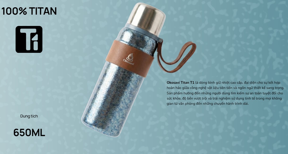 Okosavi Titan T1 là dòng bình giữ nhiệt cao cấp, đại diện cho sự kết hợp hoàn hảo giữa công nghệ vật liệu tiên tiến và ngôn ngữ thiết kế sang trọng. Sản phẩm hướng đến những người dùng tìm kiếm sự an toàn tuyệt đối cho sức khỏe, độ bền vượt trội và trải nghiệm sử dụng tinh tế trong mọi không gian từ văn phòng đến những chuyến hành trình dài.