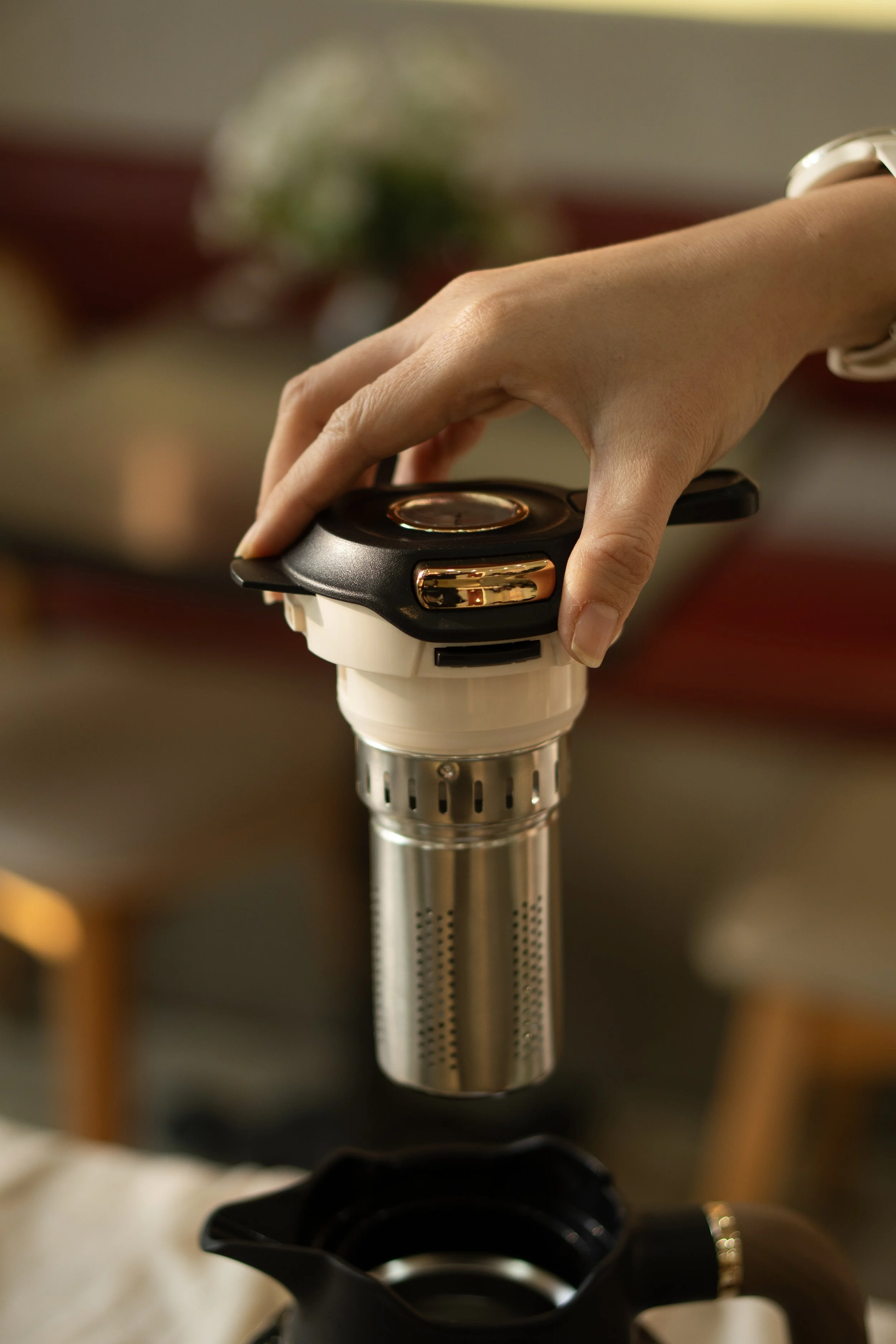 Okosavi Zenith I Lõi lọc trà chuyên dụng: Hệ thống lưới lọc siêu mịn bằng thép không gỉ cho phép trích xuất trà hoặc thảo mộc trực tiếp bên trong bình. Thiết kế này giúp tách rời bã trà, mang lại dòng nước trong trẻo và đồng nhất về chất lượng.